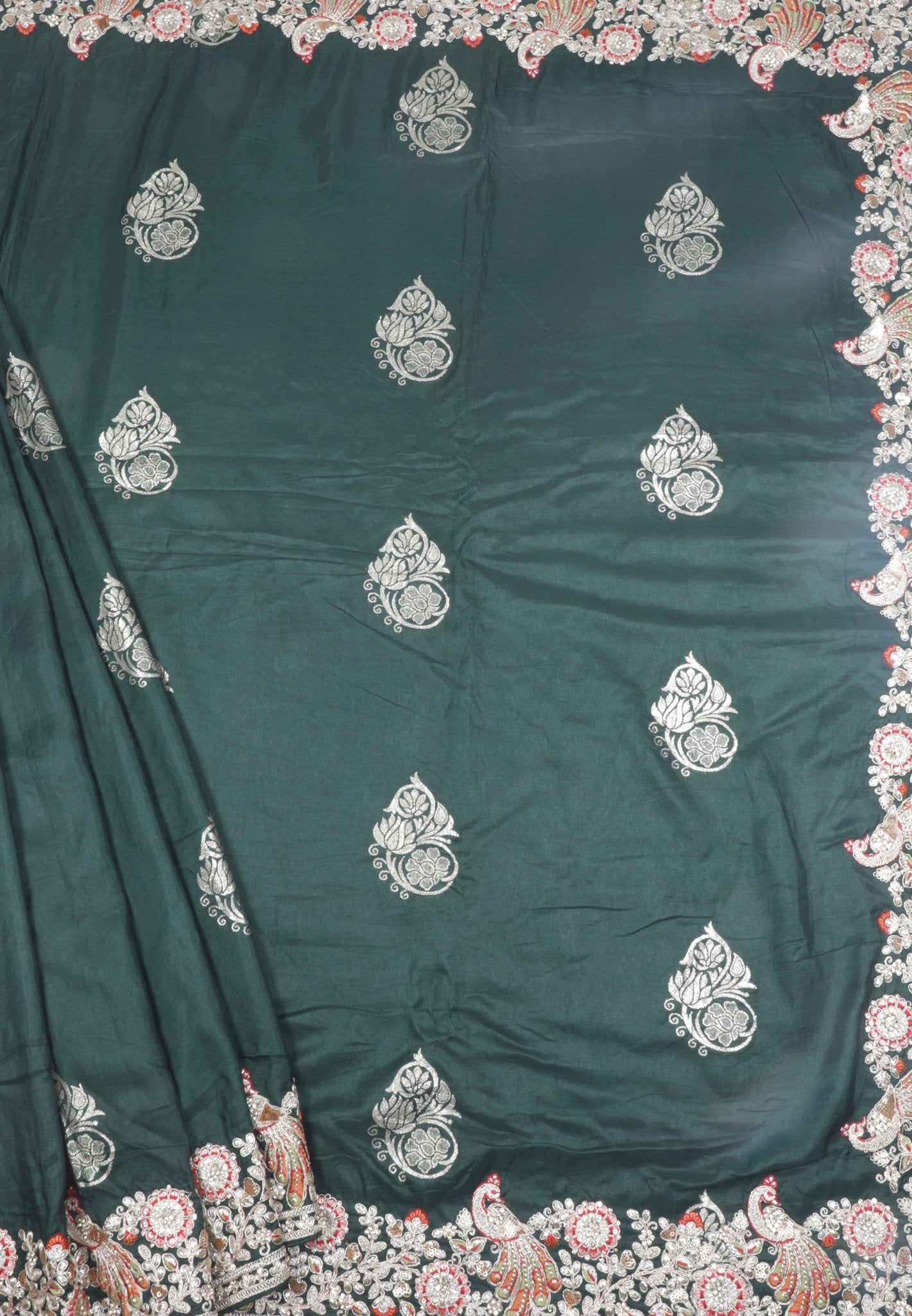 Experience the allure of tradition with this exquisite emerald green silk saree, adorned with intricate embroidery. The saree features elegant peacock motifs and floral patterns along the border, adding a touch of opulence. Perfect for weddings and festive occasions, this saree drapes beautifully, offering a luxurious feel and a sophisticated look.