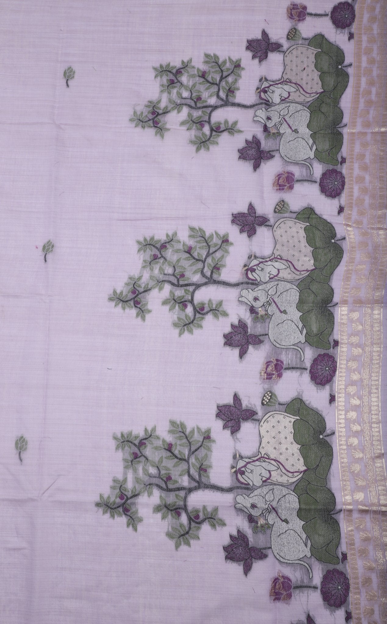 Embrace elegance with this exquisite lavender organza saree, featuring intricate elephant motif embroidery. The sheer fabric drapes beautifully, adding a touch of sophistication to any occasion. Perfect for festive gatherings or special events, this saree combines traditional artistry with modern charm.