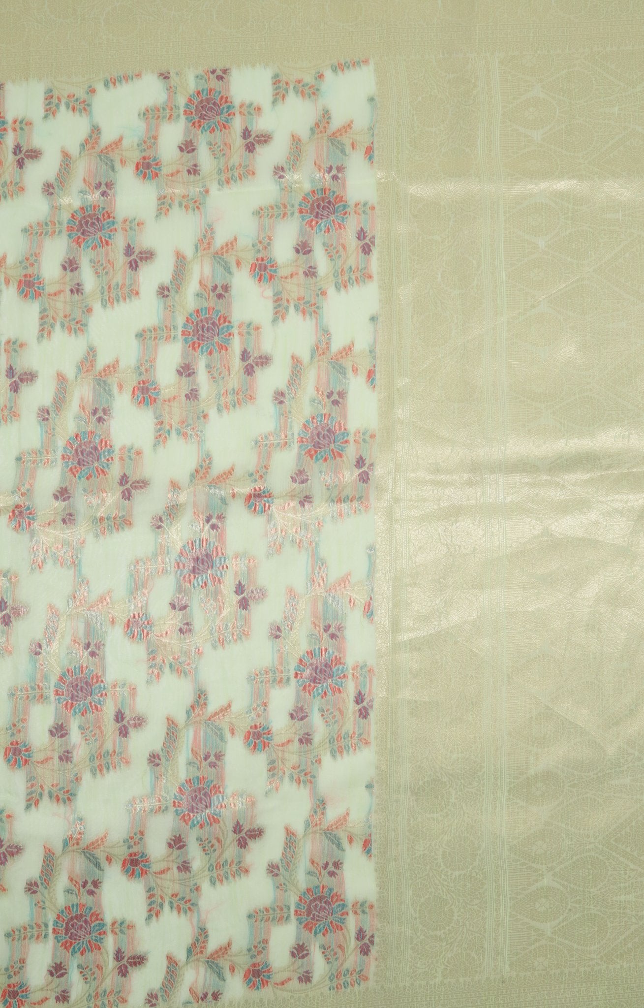 Embrace elegance with this exquisite pastel green organza saree, adorned with intricate floral embroidery. The sheer fabric offers a delicate drape, perfect for festive occasions and celebrations. The subtle sheen and vibrant floral patterns add a touch of sophistication, making it a must-have in your ethnic wardrobe.