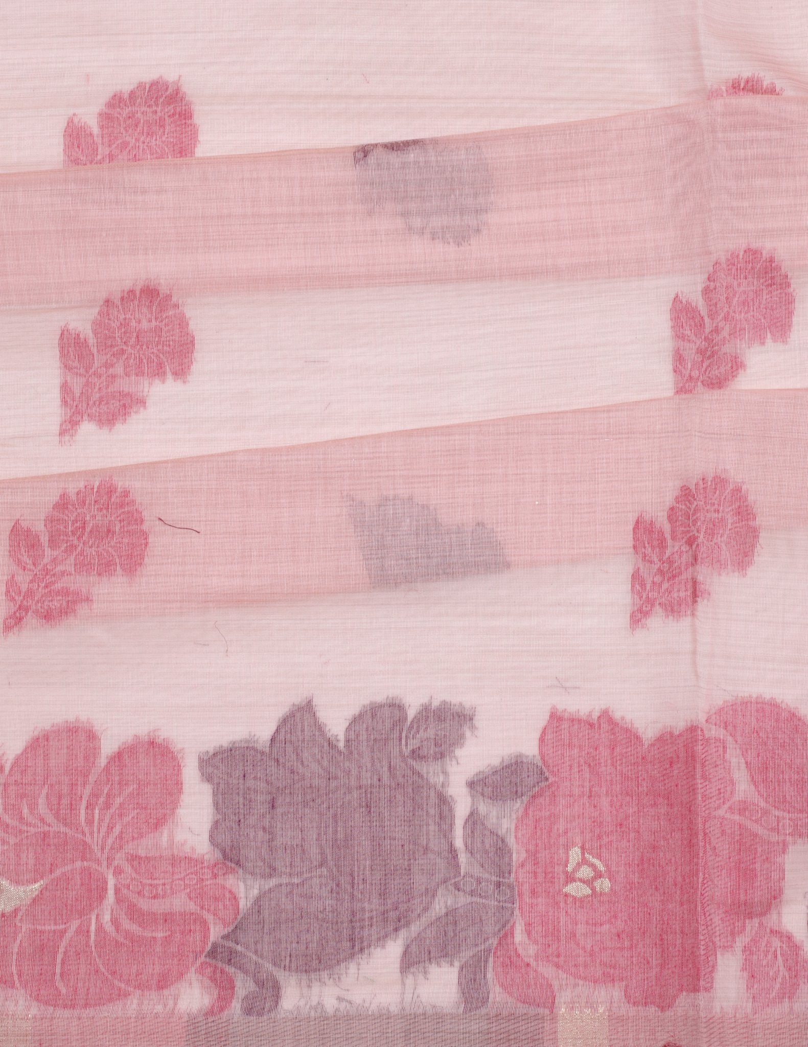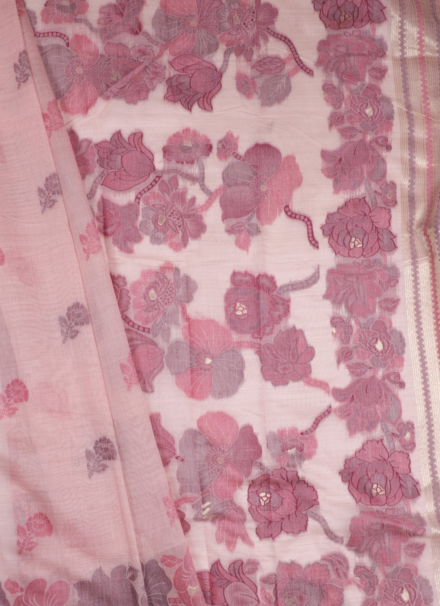 Embrace elegance with this exquisite pastel pink saree, crafted from soft cotton. Adorned with delicate floral motifs in shades of pink and purple, this saree is perfect for casual and semi-formal occasions. The lightweight fabric ensures comfort and grace, making it an ideal choice for day-long wear. Pair it with minimalistic jewelry to complete your sophisticated look.