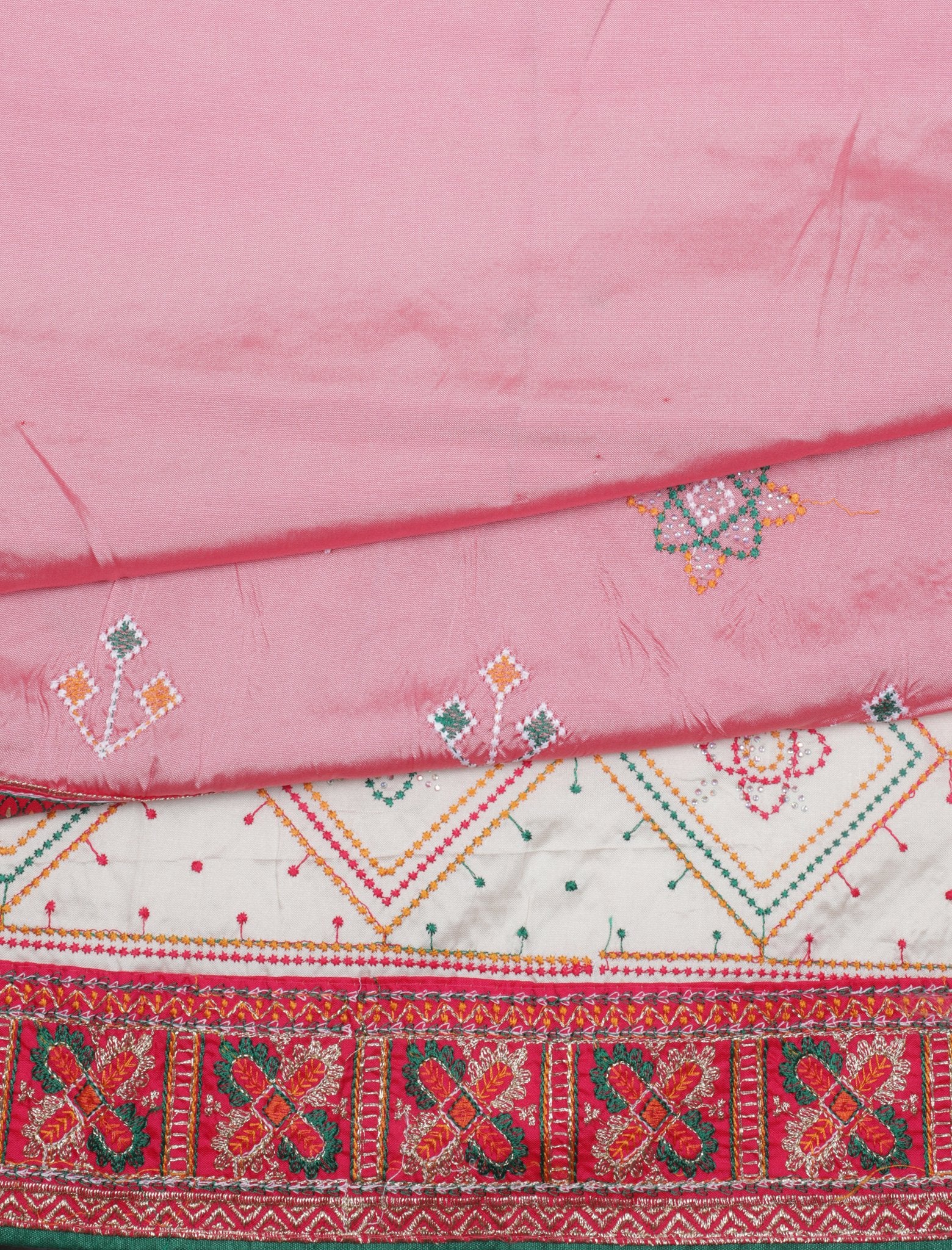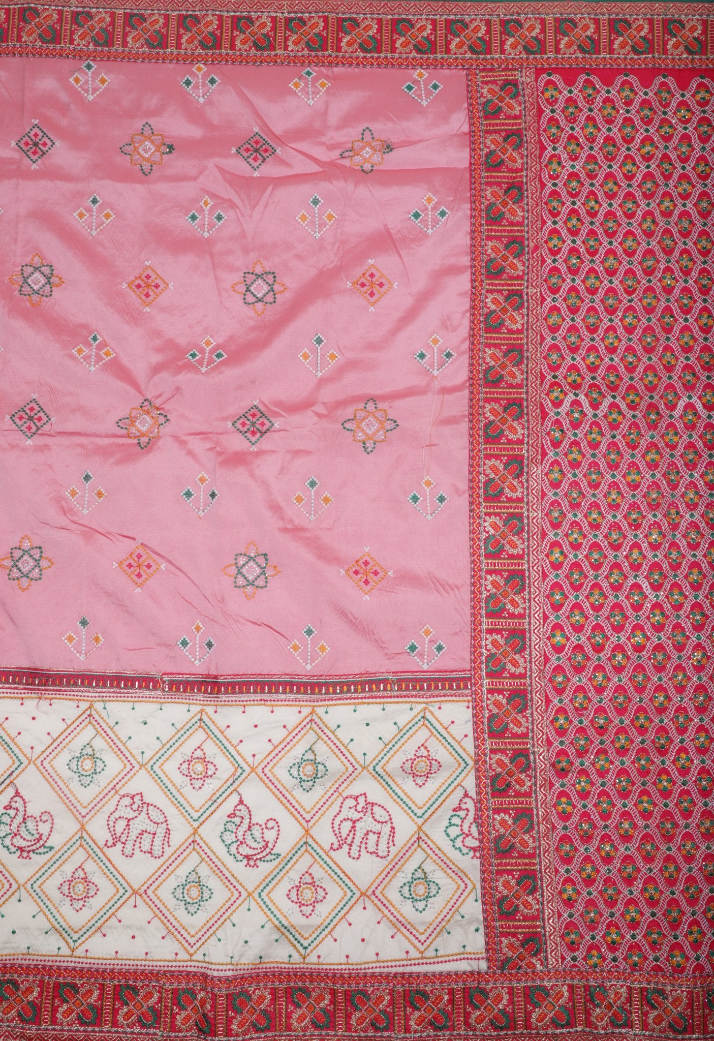 Experience the allure of tradition with this exquisite pink silk saree, adorned with intricate embroidery and vibrant motifs. The saree features a harmonious blend of geometric and animal designs, beautifully crafted to enhance its elegance. Perfect for festive occasions and celebrations, this saree promises to make you stand out with its rich texture and captivating patterns.
